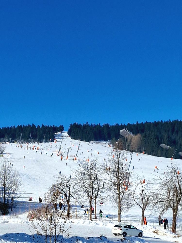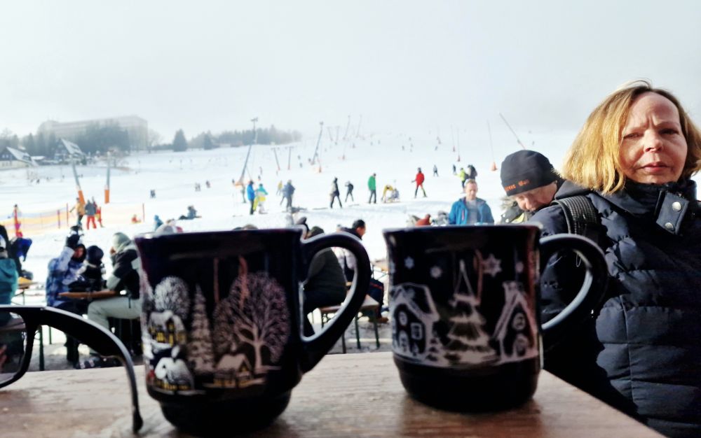 Das Wetter zeigte sich von seiner besten Winter-Seite, was bekanntlich am Fichtelberg nicht ganz so oft der Fall ist. Zumindest bis zum späten Samstagnachmittag strahlte die Sonne vom wolkenlosen Himmel und wir konnten den Ski-Trubel am Hang als Zaungäste bei Gliehbrieh, Bier und 1-2 "Kurzen" genießen.